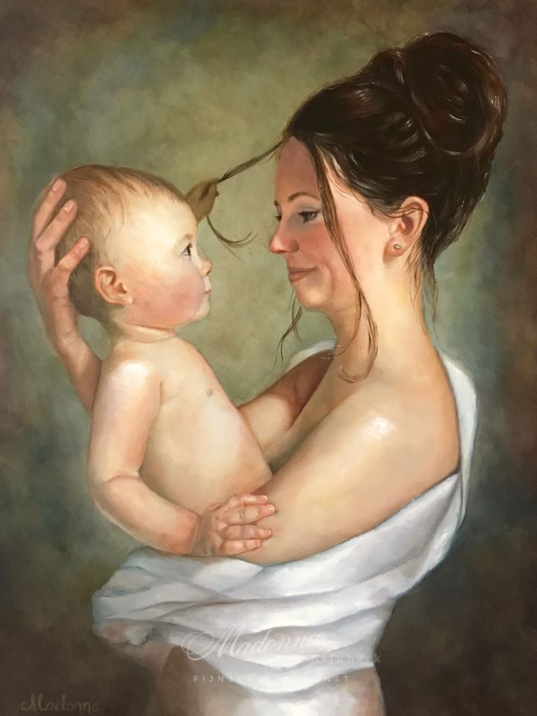 Een getekend of geschilderd portret is een waardevolle manier om een dierbare altijd in de buurt te hebben als ode aan een geliefde, (klein)kind, huisdier of als blijvende herinnering. Madonna werkt in opdracht om in de portretten de ziel, sfeer en karakter van de geportretteerde vast te leggen in een stijl die te typeren is als warm en levensecht. Neem contact op voor de mogelijkheden van een uniek persoonlijk portret.